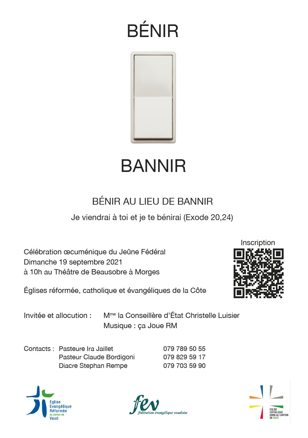 Bénir au lieu de bannir ! Tel est le slogan, un brin provocateur, choisi par le comité d’organisation de la célébration du Jeûne fédéral, le 19 septembre, au théâtre de Beausobre à Morges. Il prend son inspiration dans un texte de l’Exode : « Je viendrai à toi, et je te bénirai » (Ex 20.24). Ce temps œcuménique est organisé tous les trois ans dans la région comprise entre Morges et Rolle. Il réunit les paroisses catholiques, réformées et évangéliques.