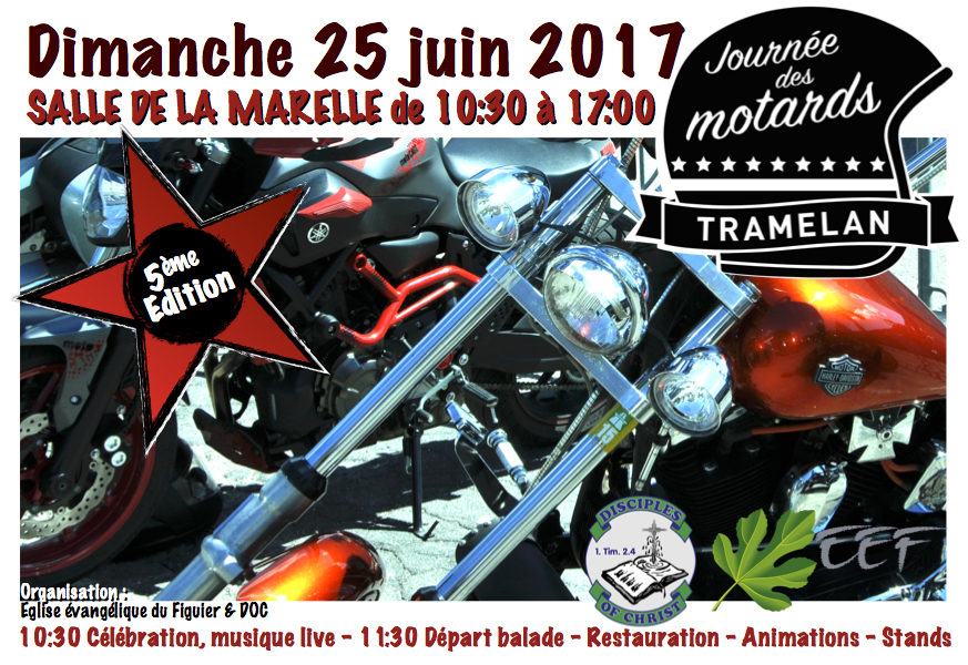 La Journée des motards aura lieu le dimanche 25 juin dans la salle de la Marelle à Tramelan. C’est au rythme d’un groupe musical ad hoc du club de motards les D.O.C. (Disciples of Christ) que les adeptes de gros cubes démarreront à 10h30 la cinquième édition de cette journée, accessible à chacun, avec ou sans moto, sans aucune distinction.
