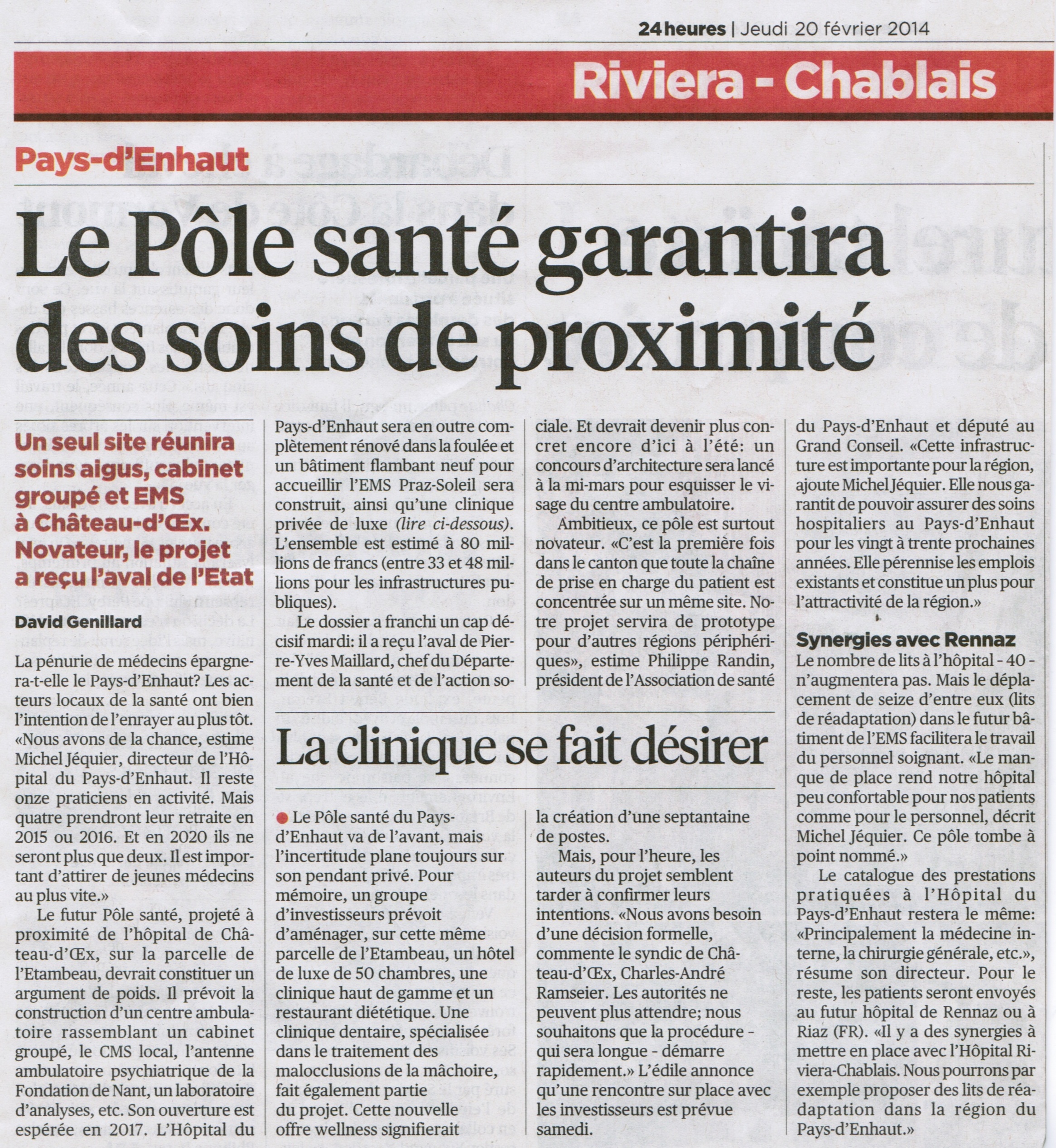 Le lancement du concours d’architecture est la première étape publique qui permettra d’ici 2017 la création du Pôle santé du Pays-d’Enhaut qui abritera, sur le site de l’Etambeau, l’Hôpital, le Centre ambulatoire, l’EMS et les logements protégés de Praz-Soleil, ainsi qu’une clinique privée « wellness » et un hôtel.